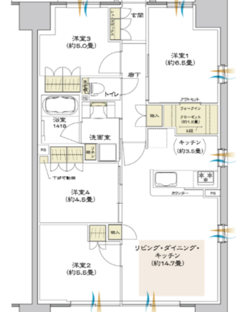 4LDK→3LDKへ間取りを変更洋室を解体して、リビングを広くしました可動式間仕切・引戸2枚×2・洋室